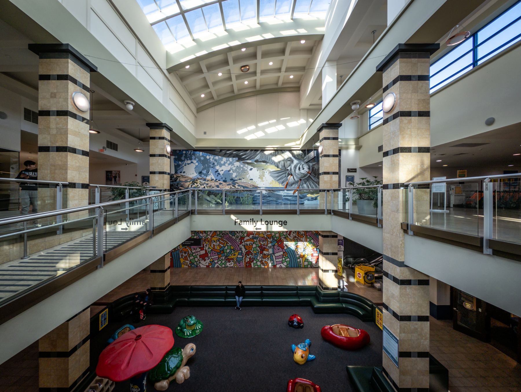 On my visit to the Connecticut Post Mall, I found it the design to be a nice blend of contemporary design with some surprising and welcome elements from its previous years. There are still plenty of retailers to choose from although some areas are burdened with vacant storefronts, and it does seem like maintenance and cleaning could use some work. Several of the escalators are out of order and while the main thoroughfares are generally well-kept, the stairways and escalators needed some janitorial attention. I prefer to focus on the aspects of malls that I enjoy: there is a nice play area for kids, there are some great murals and artwork, and there is even a little free library, which is always a great touch. The open design and multitude of skylights keep the interior bright – at least, during my daytime visit – and quite a few retailers that have closed in other malls such as Claire’s are still open here. I also liked the design of the theater and the food court had plenty of options. Overall, Connecticut Post Mall is still a unique and interesting place to visit, and I hope that it will serve the community for years to come.