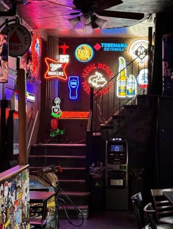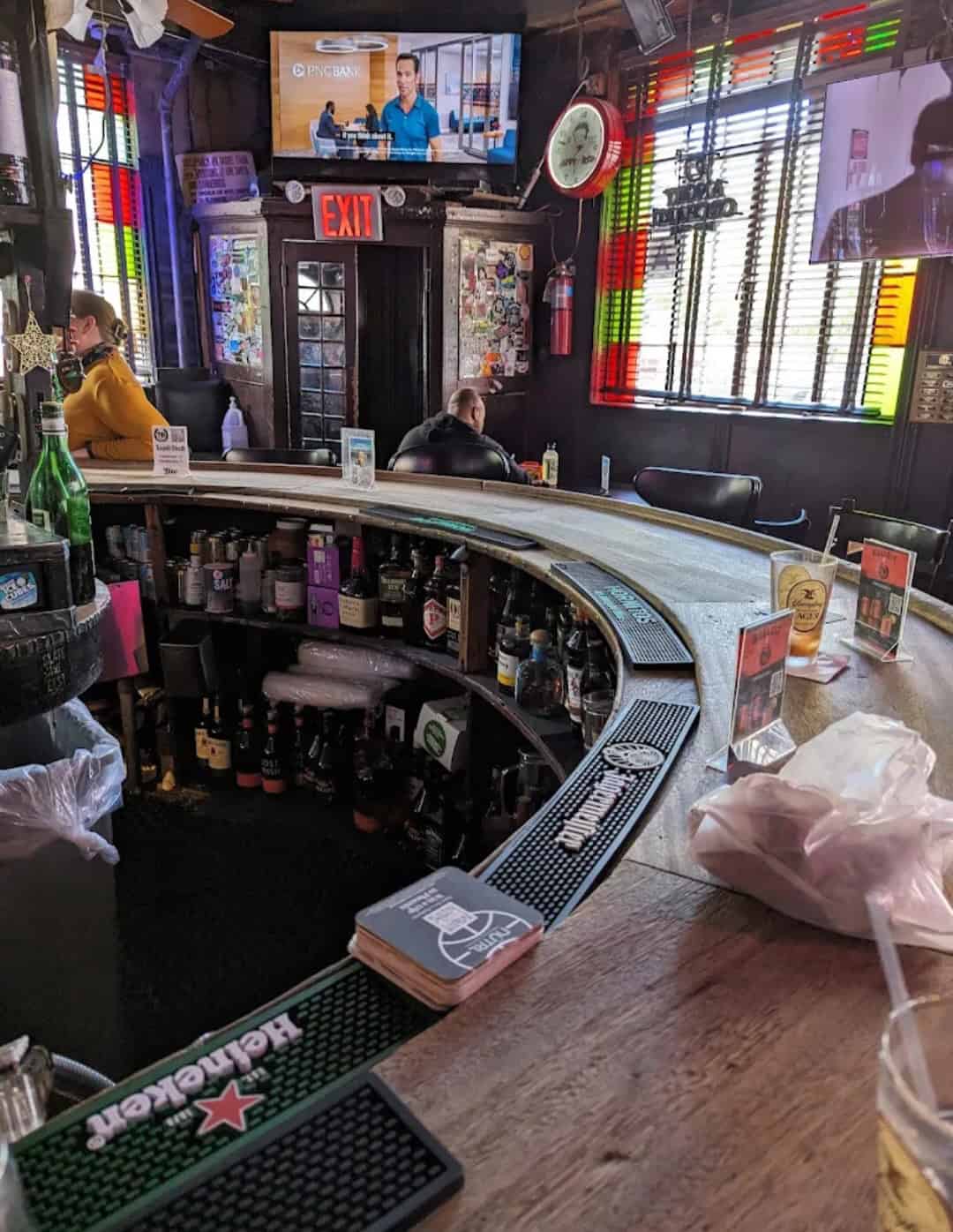 The bar gets its name from the street corner it resides on and the long horseshoe shaped bar running down the center complete with 31 beer taps. The ambience is neon signs, tv screens, pinball machines, jukebox and layers of grime.