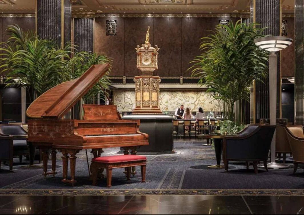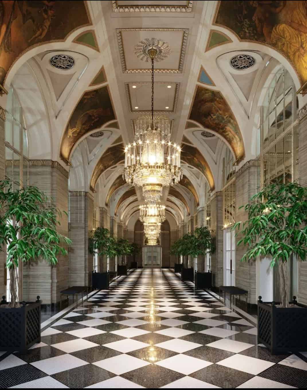 The hotel featured lavish Interiors of marble, bronze and murals with famous spaces like the Grand Ballroom and the Starlight Roof.